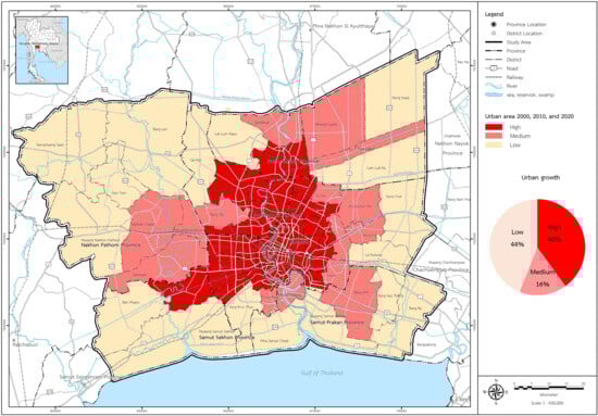 - Padon, A.; Iamtrakul, P.; Chayut, T. The Study of Urbanization Effect on the Land Use Changes and Urban Infrastructures Development in the Metropolitan Areas, Thailand. IOP Conf. Ser. Earth Environ. Sci. 2021, 738, 012077. [Google Scholar] [CrossRef]