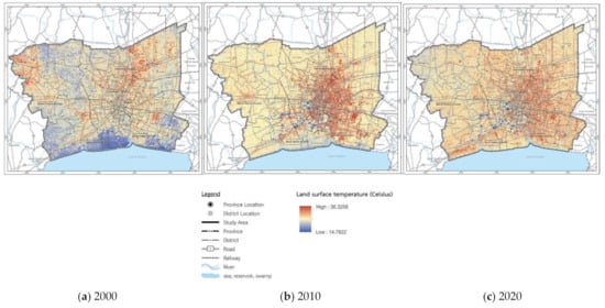 Land surface temperature (LST) in Bangkok Metropolitan Region (for the years 2000, 2010, and 2020).
