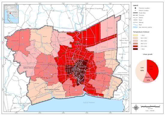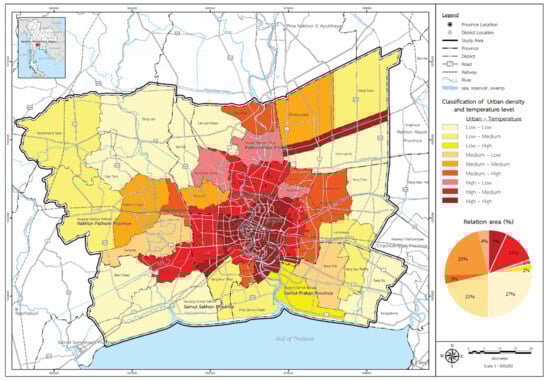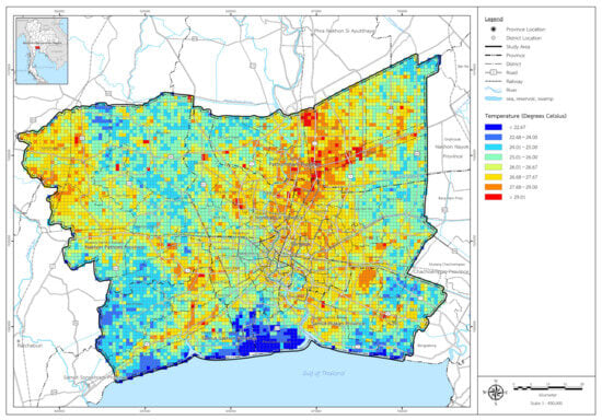 In summary, these findings highlight the diverse temperature profiles across urban areas and suggest tailored strategies for urban development and temperature management. High-temperature areas require immediate mitigation efforts, those with moderate temperatures present opportunities for balanced development, and low-temperature areas are suitable for strategic and high-quality space utilization. Based on a three-year study spanning 2000, 2010, and 2020, this paper establishes a statistically significant correlation between urban areas and changes in urban temperature (land surface temperature—LST). It was observed that the expansion of urban areas is associated with temperature rise, influencing the evolving patterns of urban development and impacting the urban environment. The analysis results further revealed that areas with higher vegetation values experienced a reduction in heat island conditions []. Additionally, over the past two decades, air temperature data was employed to examine their relationship with urban areas. The findings indicated a critical crisis level in Bangkok’s city center, and it can be extrapolated from experiences in other large cities that higher building density correlates with elevated air temperatures, contributing to various issues such as pollution problems and urban inequality among the impoverished, among other factors.
