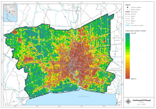Urban density in Bangkok Metropolitan Region by grid.