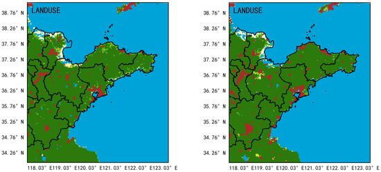 The land-use types for the second nested layer (d02) are depicted, with the left image representing the default land-use types in the WRF model, and the right image illustrating the land-use types after replacement. In the modified land-use types, urban areas are highlighted in red. Marine areas in blue, non-urbanized areas on land in green.