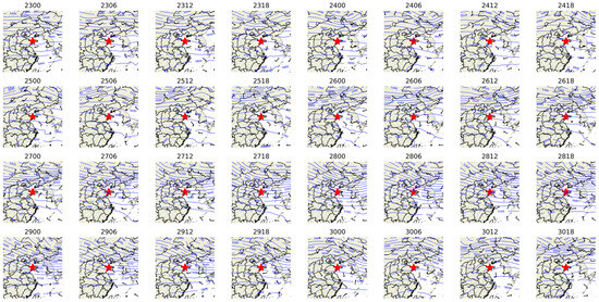 Figure 3 and Figure 4 depict images derived from ERA5 reanalysis data. The following weather analysis can be conducted based on the weather patterns and surface wind field changes depicted in Figure 3. From 23 to 30 September 2017, an examination of the 500 hPa geopotential height field reveals fluctuations in the westerly jet stream. Specifically, between the 23rd and 26th, and from the 27th to the 28th, there are two troughs passing through the 500 hPa geopotential height field, while a high-pressure ridge dominates the rest of the time. This variation indicates significant dynamic activity in the atmosphere. Furthermore, by observing the 850 hPa wind field, it is evident that westerly winds prevail during this period. This wind pattern suggests the presence of sustained southwest winds in the lower atmosphere, potentially with significant wind speeds. Such wind field structures are often associated with warm and moist air masses, which could lead to localized precipitation events.