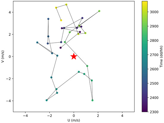 Figure 4 presents the temporal variations in meridional and zonal wind speeds. The deepening of the color-coded markers reflects the passage of time. Based on Figure 4, we can discern the changing trends in wind speed. Over the observation period, wind speeds gradually increase from initially lower levels, followed by a gradual decrease. These fluctuations in wind speed may be influenced by atmospheric circulation, such as variations in pressure gradients and interactions between high-pressure and low-pressure systems.