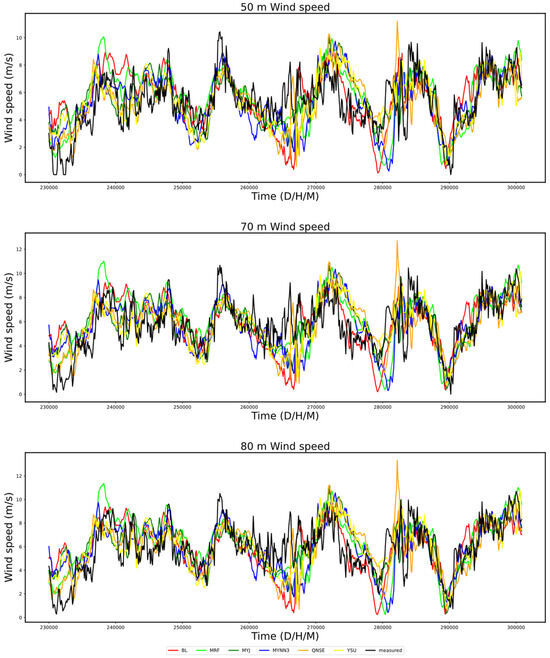 The observations from Figure 5 reveal that all six boundary-layer parameterization schemes can effectively represent the trends in wind speed variations. Across the entire simulation period, the characteristic pattern of higher daytime wind speeds and lower nighttime wind speeds is evident in all parameterization schemes, and the trends in wind speed changes are consistent across different height levels. Figure 6 illustrates the changes in the cosine of the wind direction at 80 m, revealing a transition from southerly to northerly winds during the simulation period. At the 80 m height level, the wind direction simulated in all parameterization schemes consistently matches the observed wind direction. However, a significant change in wind direction occurs from the afternoon of the 27th to the night of the 28th, which is not well reproduced by most schemes, except for the MRF and BL parameterization schemes. Vertically, the trends in wind speed variations remain consistent across all height levels, indicating that, regardless of the chosen parameterization scheme, vertical wind speed changes exhibit uniformity during the simulation period.