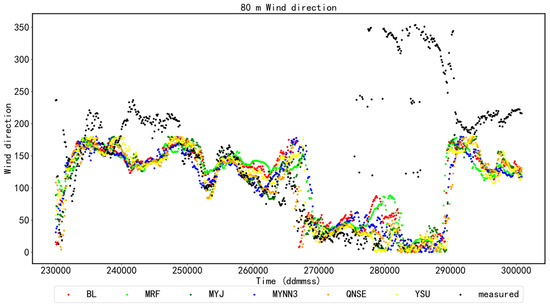 According to the results presented in Table 4, it is evident that, at a height of 80 m, the wind direction prediction accuracy relatively improved for all six parameterization schemes, with all achieving accuracy rates exceeding 55%. Specifically, the QNSE parameterization scheme performs the best, earning a wind direction matching rate of 75.62%. In contrast, the MRF parameterization scheme serves the poorest, with a wind direction matching rate of only 56.97%. The MRF parameterization scheme also exhibits the highest correlation coefficient, reaching 0.68. The YSU parameterization scheme boasts the lowest mean error rate, at 0.27, showcasing the best performance among the six parameterization schemes. Therefore, overall, the YSU parameterization scheme demonstrates relatively favorable performance across all indicators. These results suggest that adopting the YSU parameterization scheme for predicting wind speed and wind direction at an 80 m height.