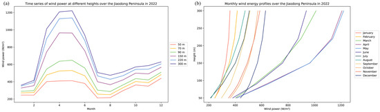 Time series of wind power at different heights over the Jiaodong Peninsula in 2022 (a) and monthly wind energy profiles over the Jiaodong Peninsula in 2022 (b).