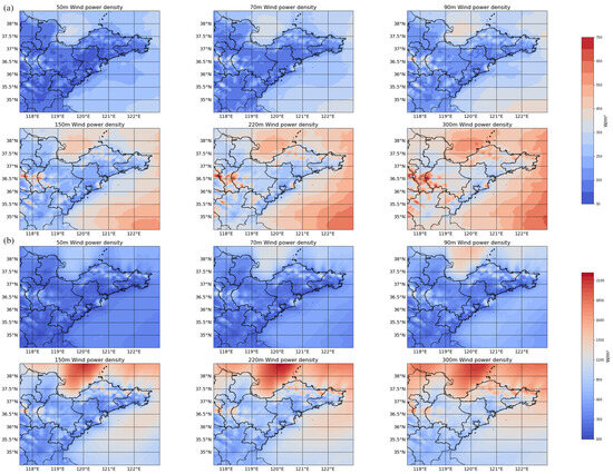 Figure 9 illustrates the wind energy density distribution calculated using ERA5 reanalysis data at a height of 100 m, where (a) represents April and (b) represents August. Compared to WRF simulations, the wind energy density calculated using ERA5 reanalysis data shows a similar trend at a height of 90 m. However, due to resolution limitations, the ERA5 reanalysis data fail to accurately reflect the finer wind energy density distribution at the 100 m height, particularly evident in the Laizhou Bay and mountainous hilly areas.
