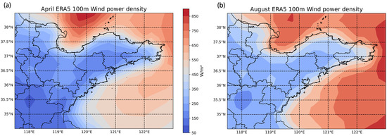 Significant seasonal variations in wind energy density were observed in the Jiaodong Peninsula from March to May of the specified year. During this period, the wind energy density in the region reached its annual peak, while a notable decrease was observed from July to August, reaching its annual minimum. Based on these observations, we selected April as a representative month with high wind energy density and August as an expected month with low wind energy density for detailed analysis, as depicted in Figure 8.