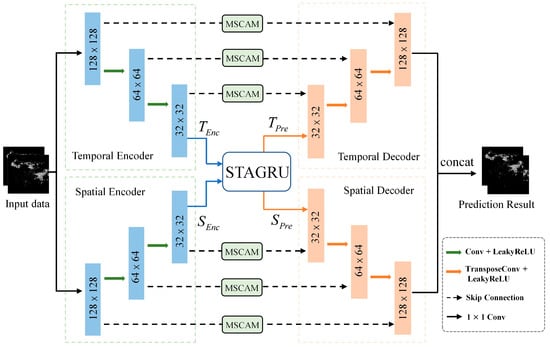 The proposed model comprises a Temporal Encoder (TE), a Spatial Encoder (SE), a Spatial Decoder (SD), a Temporal Decoder (TD), a Multi-Scale Channel Attention Module (MSCAM), and a Spatiotemporal Attention-Gated Recurrent Unit (STAGRU). The TE and SE are employed to extract intricate features from the radar images. MSCAM is positioned within skip connections to extract local and global contextual features from the encoded information. The Spatiotemporal Attention-Gated Recurrent Unit (STAGRU) is utilized to capture spatiotemporal relationships and long-term dependencies. TD and SD are used to output the image after reduction.