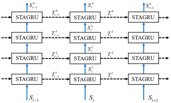 To further extract more effective deep spatiotemporal features, it is common to stack four STAGRU units together to form an integrated extrapolation architecture, as illustrated in