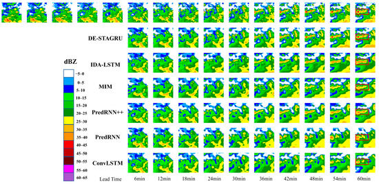 Figure 6. The color bars on the right side represent the echo intensities corresponding to the different colors. The red color in the color bar corresponds to regions with echo intensities greater than 40 dBZ. When the radar image contains red or darker-colored areas, it indicates that severe weather is occurring in the area. All models are extrapolating the first row’s subsequent ten images based on the first row’s initial five images.