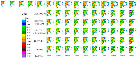 Figure 7. From the figure, it can be observed that the extrapolation results of STGRU exhibit a gradually smooth trend, with some regions gradually disappearing. However, the DESTGRU model, which incorporates the dual-branch encoder–decoder structure, is capable of extracting more spatiotemporal features, leading to more accurate predictions of the locations of echo regions. The introduction of the MSCAM module in DESTGRU enables the extraction of local and global contextual features of the encoded representation, thus enhancing the level of detail in the predicted images. Additionally, the TAM module in DESTGRU expands the receptive field of the prediction units, resulting in more accurate predictions of high-echo regions. The standard DE-STAGRU model achieves the best forecasting performance, highlighting the effectiveness of incorporating MSCAM and TAM into the dual-branch encoder–decoder structure and the overall improvement in prediction accuracy.