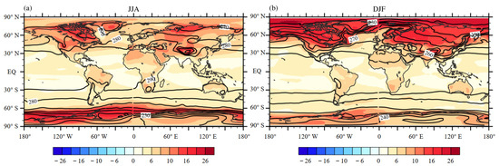 2 climate. The global annual mean SAT increases by 6.29 K in JJA and 6.66 K in DJF between the experiments of 4 × CO