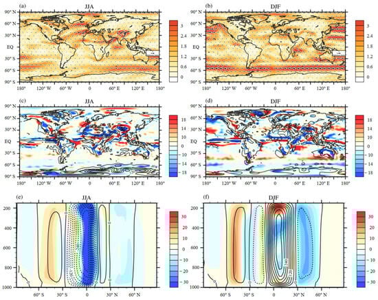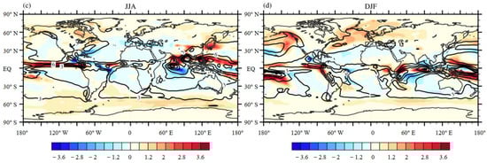 Figure 3c,d). In JJA, increases in precipitation are located in the tropical regions of the NH, especially over oceanic regions at 10° N, such as the central Pacific Ocean, South Asia, and their neighboring oceanic regions (