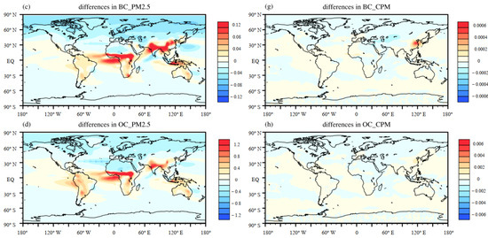 Figure 4e) since changes in BC (CPM) and OC (CPM) column concentrations are about two orders of magnitude smaller than the corresponding concentrations of fine particles in JJA. Therefore, the paper does not pay more attention to changes in carbon particles in JJA. Increases in anthropogenic CPM over central Africa are consistent with those of fine particulate matters, which could be put together in the discussion of the climatic factors, as in the following sections.