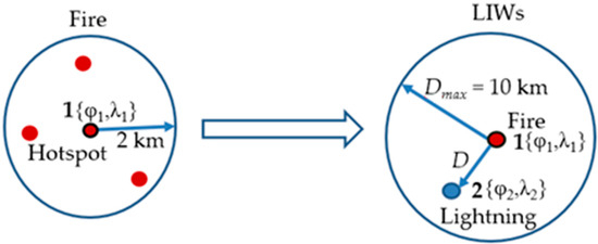 To decrease the number of hotspots, we combined them in a fire cluster that began with a single hotspot that first recorded in time. Further, all neighboring hotspots located in space with a radius of 2 km and, in time, 1 day belonged to one cluster—a fire (Figure 1: left panel). To identify LIWs, we used the following algorithm (Figure 1):