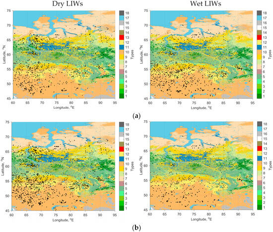 Spatial distribution of Dry LIWs and Wet LIWs (B > 0%, holdover period = 6 days) over Western Siberia for the warm seasons of 2016–2021: tv = 0.25 mm/day (a); tv = 2.5 mm/day (b). Color scale—vegetation zones [47]: 1—evergreen needleleaf forests; 2—evergreen broadleaf forests; 3—deciduous needleleaf forests; 4—deciduous broadleaf forests; 5—mixed forests; 6—closed shrublands; 7—open shrublands; 8—woody savannas; 9—savannas; 10—grasslands; 11—permanent wetlands; 12—croplands; 13—urban and built-up lands; 14—croplands/natural vegetation mosaics; 15—permanent snow and ice; 16—barren; 17—water bodies; and 18—unclassified. The black dots are LIWs.