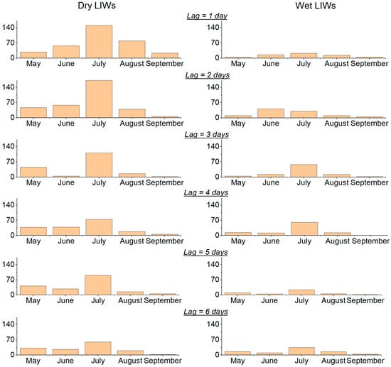 Seasonal variability of Dry LIW (left panel) and Wet LIW (right panel) numbers (B > 80%) in dependence of lag (time between lightning and ignition) over the northern part of Western Siberia for 2016–2021. The precipitation threshold is 2.5 mm/day.