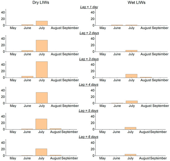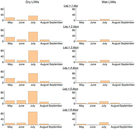 Seasonal variability of Dry LIW (left panel) and Wet LIW (right panel) numbers (B > 80%) in dependence of lag (time between lightning and ignition) over the central part of Western Siberia for 2016–2021. The precipitation threshold is 2.5 mm/day.