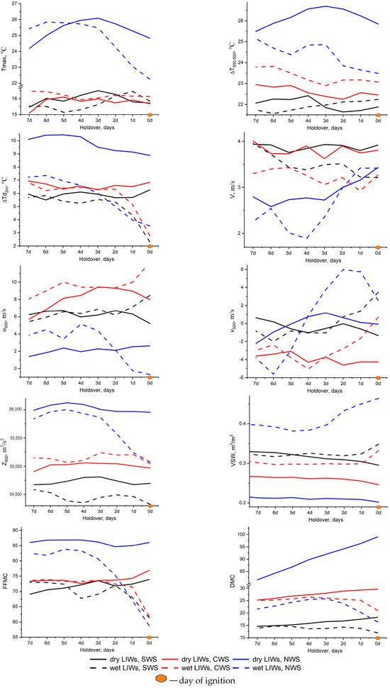 The meteorological conditions preceding selected cases of Dry and Wet LIWs for each day before the ignition in Western Siberia for 2016–2021 are presented in Figure 6.