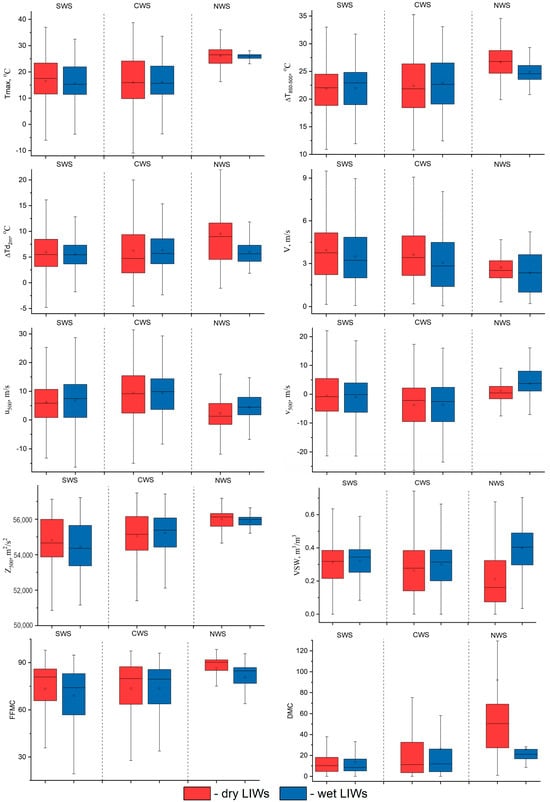 As for ∆Td850, the greatest values of interquartile ranges are observed for Dry LIWs in CWS, and the smallest for Wet LIWs in NWS (Table 2 and Table 4, Figure 7). Wind speed, on the contrary, has the greatest variability for Wet LIWs, especially in CWS. Estimates of zonal wind component in the middle troposphere (u500 and v500) in SWS and CWS decreases by the day of ignition for Dry LIWs and increases for Wet. However, we should note that statistically significant values for wind components were derived only for Wet LIWs in CWS.