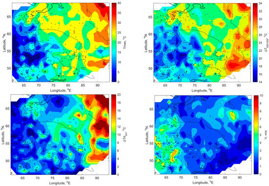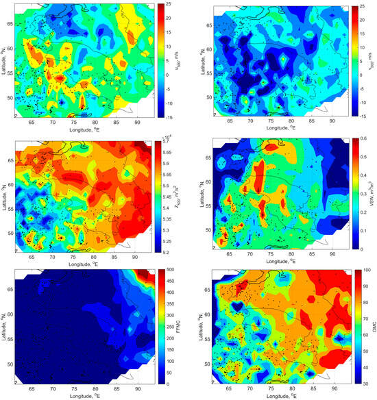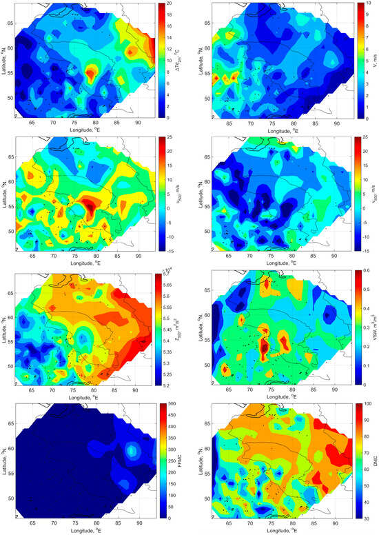 In spite of the fact that the spatial distributions of meteorological parameters and fuel moisture characteristics preceding ignitions from dry lightning and from lightning with precipitation are similar, in general, they have some specific features for each group (Figure 8 and Figure 9). The common feature is in the meridional type of spatial distributions for Tmax, ∆T850−500, ∆Td2m, Z500, FFMC, and DMC: areas with maximum values are predominantly situated in the eastern part of WS (mountain regions in the northeast and southeast), and areas with minimum values are situated in the western part (where zones of mixed forests and peatlands are situated). It also coincides with the spatial distribution of fires from dry lightning (Figure 8). However, in the north, we observe that the situation is somehow different: most of revealed cases near the gulf of the Ob River are situated in the areas of Tmax, ∆T850-500, ∆Td2m, and DMC maximum. An opposite situation is observed for wind speed at the surface; it is higher in the western part than in the eastern one. And in the northern part, near the gulf of the Ob River, LIWs occur under the influence of eastern transfer. As for VSW, areas with maximum values are predominantly located in the center parts of SWS, CWS, and NWS, which correspond to peatland and permafrost zones.