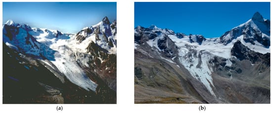 The Djankuat Glacier: (a) in 1995; (b) in 2022.