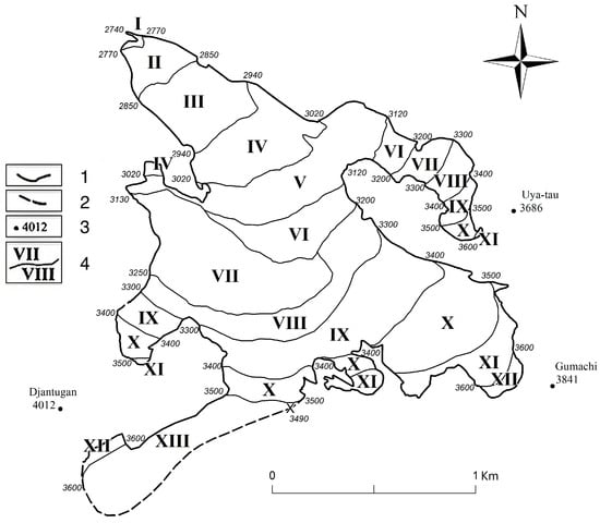 Alti-morphological zones of the Djankuat Glacier (topography of 2018): 1—glacier boundary; 2—ice divides; 3—main summits and their absolute height; 4—alti-morphological zones, their numbers and contours.