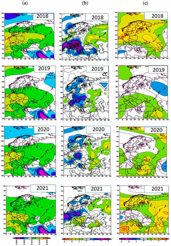 Atmospheric pressure at the sea level (a) as well as anomalies of precipitation (b) and air temperature (c) at the 700 hPa isobaric surface, averaged over the warm season (May–September), in 2017/2018–2020/2021 (mapped by the data of the Main Weather and Environmental Centre of the USA [27]).