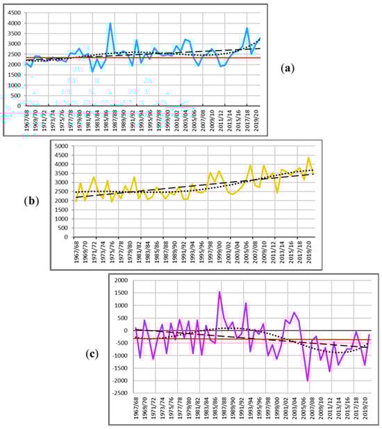 Shown are 54-year-long series of accumulation (a), ablation (b), and mass balance (c), mm w.e., of the Djankuat Glacier: annual values (solid lines), linear trends (dashed lines), and time series approximations by the 4th-order polynomial (dotted lines).