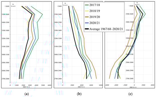 Accumulation (a), ablation (b) and mass balance (c), mm w.e., of the Djankuat Glacier versus altitudinal belts in 2017/2018–2020/2021 and averaged over 54 years.