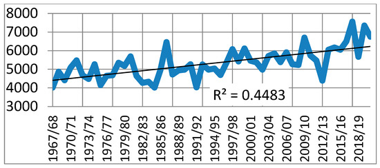 Finally, another characteristic feature of the long series of mass-balance observations at Djankuat is the revealed tendency to increase glacier turnover. Turnover is understood as [36] the annually calculated sum of accumulation and ablation values taken modulo. This parameter indicates the glaciation energy, which is the leading indicator characterizing the intensity of the external mass exchange of an alpine glacier. In quantitative terms, it is traditionally [37] calculated as the sum of vertical gradients of accumulation and ablation near the equilibrium line. Hence, the glacier turnover reflects the general climatic conditions in which the glacier exists. The final years of the monitoring series (Figure 10) are clearly distinguished by their increased mass exchange. The 2017/2018 balance year with its absolute turnover record of 7560 mm w.e. became the undisputed leader among all other years of the 54-year-long series, and the values of 2019/2020 and 2020/2021 (7350 and 6750 mm, respectively) occupy honorable second and third places in this series.