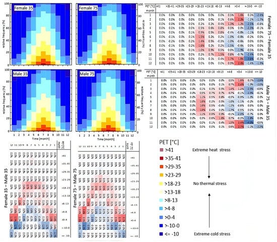 For the evaluation of human thermal comfort, air temperature alone is insufficient []. Other atmospheric factors, such as the relative humidity, wind speed, and radiation fluxes, significantly influence human thermal perception. Therefore, we used long-term measurements of the hourly data of the official WMO station in Findel to calculate the PET with the RayMan Pro 3.1 model for 15 years, starting in 2006. Different genders and ages were considered to account for the different sensitivities of the human body. Figure 1 shows the results of the PET calculation for males and females at different ages as the relative frequency distribution (left side of the figure), as well as the differences in the tables on the right side and below the histograms. The distribution of the PET values shows a typical annual course for a location in Central Europe with the highest PET values in July and August indicating moderate to strong heat stress conditions during up to 10% of the hours. Only 48 h for females (35 years old) and 55 h for males (35 years old) with extreme heat stress were identified for the meteorological summer seasons. The maximum number of hours (up to 24%) with no thermal stress, indicated by PET values between 18° and 23°, also occurred in the summer months for both gender and age groups. In general, older people, independent of their gender, were more sensitive to heat stress. This is indicated by the positive differences (red shading) in the tables on the right side of the figure. The positive differences varied between 0.1% and 2.7% and showed the same pattern for both genders. The inter-gender differences showed the same pattern, but with slightly lower values ranging up to 1.1%. Comparing the results for male and female persons, a slightly higher vulnerability towards heat stress for female persons was observed.