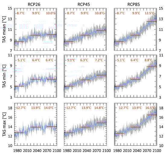 Multi-model ensemble of mean, minimum, and maximum air temperature values for Luxembourg for three different Representative Concentration Pathways (RCPs). The spread (gray) is defined as +/− one standard deviation of the ensemble. Red (lines and numbers) represents the 30-year long-term averages for the reference (1971–2000), near (2021–2050), and far future (2070–2099) periods.
