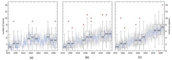 Annual multi-model mean values of the Heat Wave Numbers (HWNs) for RCP26 (a), RCP45 (b), and RCP85 (c) (blue lines). The spread of the ensemble is defined as +/− one standard deviation (gray shaded area), red dots = outliers. In addition, boxplots for 10-year time slices for the reference (1971–2000), near (2021–2050), and far future (2070–2098) periods are given; period: 1971–2099.