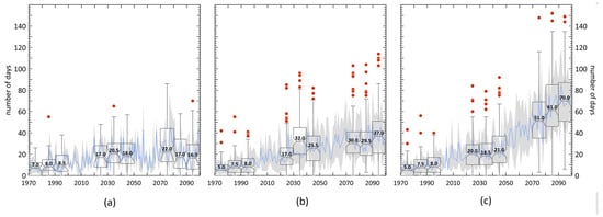Annual multi-model mean values of the number of days that contribute to heat waves (HWFs) for RCP26 (a), RCP45 (b), and RCP85 (c) (blue lines). The spread of the ensemble is defined as +/− one standard deviation (gray shaded area), red dots = outliers. In addition, boxplots for 10-year time slices for the reference (1971–2000), near (2021–2050), and far future (2070–2098) periods are given; period: 1971–2099.