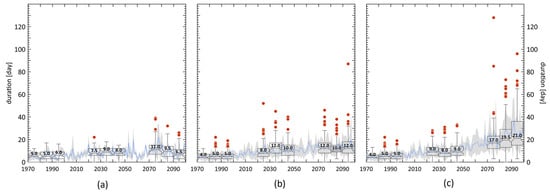 Annual multi-model mean values of the Longest Heat Wave (HWD) length for RCP26 (a), RCP45 (b), and RCP85 (c) (blue lines). The spread of the ensemble is defined as +/− one standard deviation (gray shaded area), red dots = outliers. In addition, boxplots for 10-year time slices for the reference (1971–2000), near (2021–2050), and far future (2070–2098) periods are given; period: 1971–2099.
