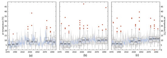 The time-series data were obtained by the use of a bilinear resampling algorithm (using the Climate Data Operators, CDO, v1.8.1 software, https://code.mpimet.mpg.de/projects/cdo; accessed on 15 January 2022) from the EUR-11 RCM model grid. However, certain inconsistencies were noted between the models. For instance, in model M13, leap years were not taken into account, while in model M5, the first day (1 January 1971) was missing. Gaps due to leap years were filled via a linear interpolation and the missing values for 1 January in M5 were replaced by the values of 2 January. The time-series data of air temperature showed no other anomalies, such as gaps, missing values, or outliers.