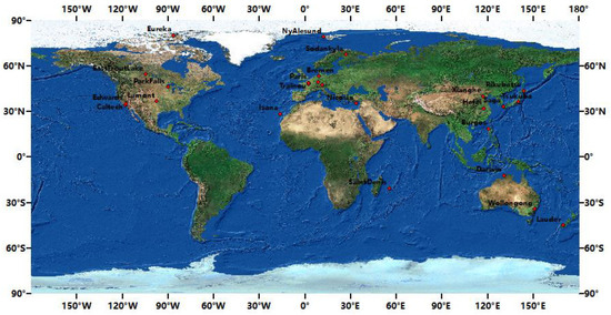 The Total Carbon Column Observing Network (TCCON) is a global observational network that gathers high-precision atmospheric greenhouse gas (primarily CO2 and CH4) concentrations from ground-based Fourier transform spectrometers. TCCON was established in 2004, and has expanded from its initial 3 sites to the current 26 official sites [17]. Figure 1 illustrates the distribution of TCCON sites, primarily located in North America, Europe, and the East Asia.