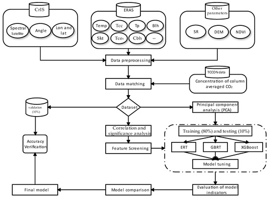 The estimation process of the concentration of XCO2 from thermal infrared satellite data based on ensemble learning in the thermal infrared is shown in Figure 2. Firstly, the data were standardized to a daily temporal resolution and a unique spatial resolution of 1°. Due to the large number of features, two methods were employed to construct datasets to select the optimal feature parameters: correlation significance analysis and principal component analysis. The datasets were randomly divided into training sets (80%), testing sets (10%), and validation sets (10%). Three different ensemble learning models (ERT, XGBoost, GBRT) were employed and compared over two datasets. The final objective is to choose the model with the lowest RMSE in the estimation of XCO2 concentration.