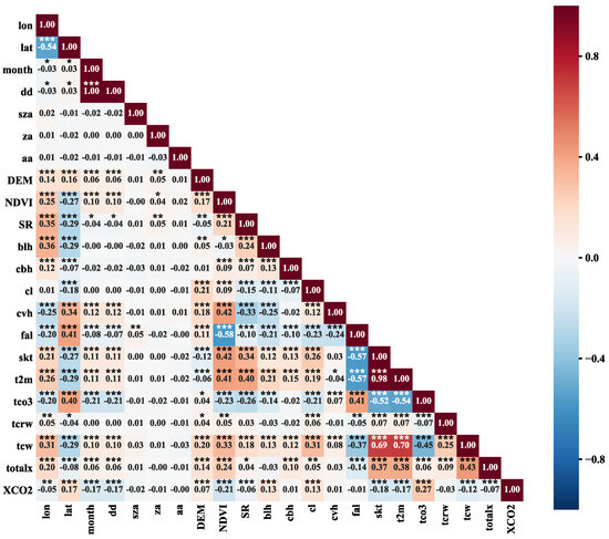 Correlation and significance heatmap of XCO2 with features (*, **, *** = significant at 0.01, 0.05 and 0.001 probability levels).