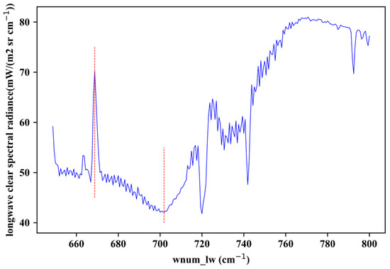 In Figure 3, the heat map of correlation coefficients shows a positive correlation in red and a negative correlation in blue, and the number of stars shows the level of significance. Sensitivity was assessed in each case by examining the correlation coefficient® and its level of statistical significance (p-value). XCO2 showed a positive correlation with lat, DEM, blh, cl, and tco3, with a significance of 0.01. Among these factors, tco3 has the highest positive correlation, which is 0.27. XCO2 showed a negative correlation with lon, month, dd, NDVI, skt, and t2m, and NDVI showed the highest negative correlation of −0.21. Other features exhibited low or no correlation with XCO2, so they were all removed. Ultimately, lat, lon, month, dd, NDVI, skt, t2m, DEM, blh, cl, and tco3 were retained. The selection of spectral bands involved choosing two channels around 15 µm that are sensitive to CO2 but not sensitive to other variables, based on the Jacobian function, as mentioned in [11]. Figure 4 illustrates the selected bands, denoted by red lines. The final selected two spectral bands corresponded to radiance at wavelengths of 668.75 cm−1 and 701.875 cm−1.