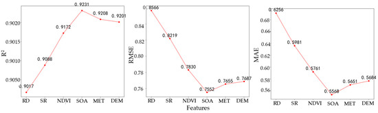 In this work, principal component analysis was conducted on 717 channels within the spectral range of 648.75 cm−1 to 1096.875 cm−1 which had information on CO2 absorption, and the first three principal components scores were computed to represent the information from 717 channels. Similarly, principal component analysis was conducted on meteorological data on ten pressures (100–1000 hPa), and temperature (T), vertical wind speed (U), horizontal wind speed (V), vertical wind speed (W) on these ten pressures, and the first three principal components were selected to represent meteorological data. Additionally, one principal component was chosen to represent satellite observed geometry information. Additionally, surface parameters such as NDVI, SR, and DEM have become crucial for the upward atmospheric radiation. The initial dataset was constructed by employing spatial–temporal and spectral characteristics as reference benchmarks. This study investigates the influence of additional parameters on model correctness through the utilization of the ERT model. Figure 5 illustrates the values of R2, RESE, and MAE for the ERT model that was trained using various features. The results demonstrated that the features such as NDVI, SR, and PCA scores of the observed geometry information of satellites (abbreviated as SOA) resulted in a noteworthy enhancement of the R2 value of the model. Furthermore, a decrease in RMSE and MAE values suggested a favourable impact of these features on the overall performance of the model. The first three principal components score of meteorological data and DEM exhibited a minimal or negligible impact on the accuracy of the model. Consequently, these features were excluded from the dataset.