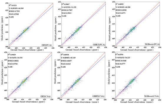 Figure 6 showed a scatter plot of the XCO2 concentration of the three different ensemble learning models (ERT, XGBoost, GBRT), with datasets derived from the testing dataset. Comparing these three models, the R2 of XCO2 prediction built from the PCA was found to be significantly higher than that from the correlation and significance analysis. The ERT model demonstrated the best agreement (as shown in Table 4), with an R2 of 0.9231, an RMSE of 0.7552 ppmv, and a MAE of 0.5568 ppmv. The result showed that the R2 of the ERT model was higher, and the RMSE and MAE were lower than those of the other models.