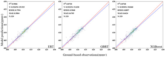 Figure 7 shows a scatter plot of predicted XCO2 concentration in the validation set. These three learning models were validated using validation sets. The results show that the R2 values were 0.9006, 0.8720, and 0.8769 for ERT, GBRT, and XGBoost, respectively. The RMSE values were 0.7994, 0.9068, and 0.8897, and the MAE values were 0.5804, 0.6705, and 0.6624(as shown in Table 5). The ERT had the highest R2 and the lowest RMSE and MAE. Combining these with consideration of three model evaluation indicators, the ERT model showed the best agreement in model validation, with high prediction accuracy and minimal prediction errors. Thus, the ERT model was finally selected to estimate the concentrations of XCO2.