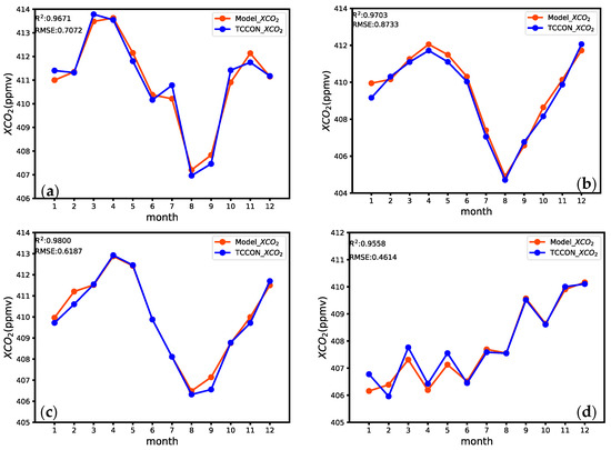 Based on the global distribution of TCCON sites, the results of ground-based observations and model predictions were categorized into four groups: such as Asia, Europe, South America, and Oceania. The model predicted results were compared with the monthly means and standard deviations of the TCCON measurements (as shown in Figure 9). The R2 and RMSE values for the monthly mean values of TCCON observations and model predictions are as follows in the four regions: Asia (R2 = 0.9671, RMSE = 0.7072 ppmv), Europe (R2 = 0.9703, RMSE = 0.8733 ppmv), North America (R2 = 0.9800, RMSE = 0.6187 ppmv), and Oceania (R2 = 0.9558, RMSE = 0.4614 ppmv). The monthly averages of XCO2 concentrations of model prediction and TCCON observations are generally consistent in the four regions. The concentration of XCO2 at the sites located in Asia, Europe, and North America demonstrate a declining pattern throughout June to August, followed by a steady increase in the subsequent months from August to December.