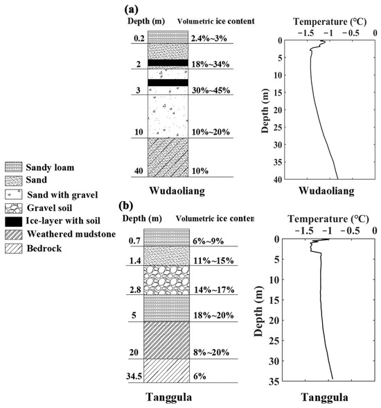 Stratum conditions, ground ice contents and the annual average temperature–depth curves in 2015 at (a) Wudaoliang and (b) Tanggula.
