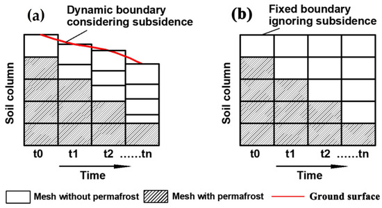 Illustration of (a) the moving-mesh permafrost model with ground subsidence consideration, and (b) the fixed-mesh permafrost model without ground subsidence consideration.