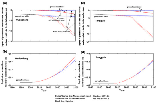 Under the SSP1-2.6 scenario, the simulated total ground subsidence is 0.382 m at Wudaoliang and 0.324 m at Tanggula by 2100. The ALTs in the results of the two models are not very different, but the remaining permafrost thicknesses in the results of the moving-mesh model are 0.462 m and 0.304 m smaller than those in the results of the fixed-mesh model by 2100 at Wudaoliang and Tanggula, respectively.