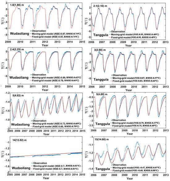 Comparison of the simulated ground temperatures from the moving-grid model with the observations in the representative soil layers at the three study sites. The depths of the spatial grids to the ground surface are changed with time because of thaw settlement consideration in the moving-grid model. The value to the left of the bracket at the top left corner of each of the subgraphs is the initial depth of the corresponding spatial grid in 1966, while the value in the bracket is the final depth of the corresponding spatial grid in 2018 in the moving-grid model.